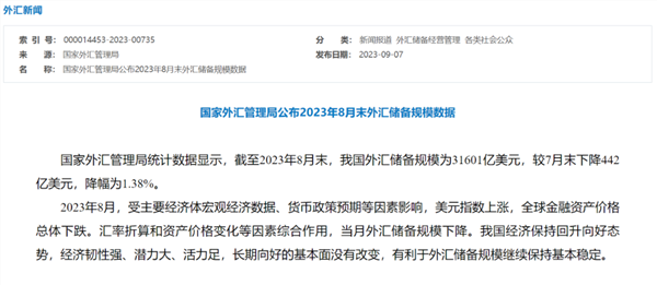 9月7日,国家外汇管理局公布2023年8月末外汇储备规模数据。数据显示,截至2023年8月末,我国外汇储备规模为31601亿美元,较7月末下降442亿美元,降幅为1.38%。