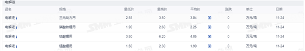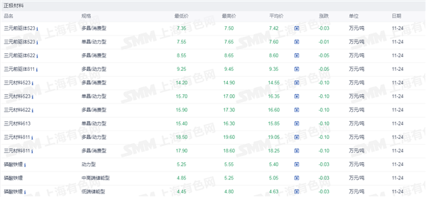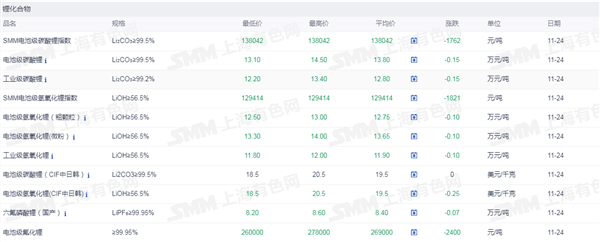 证券之星新能源车行业周报:据上海有色网,截止11月24日,电池级碳酸锂13.1-14.5万元/吨,均价13.8万元/吨,环比上一工作日下滑0.15万元/吨;工业级碳酸锂12.2-13.4万元/吨,均价12.8万元/吨,环比上一工作日下滑0.15万元/吨。今日锂盐企业延续挺价出售散单的态度,依然以长单出货为主;而在近期碳酸锂现货价格连续下跌后,下游少部分正极材料企业采买情绪略微转变,个别正极材料企业在现货价格低位时期进行少量采买,但整体现货市场的散单成交量级仍较平淡,并未出现明显放量情况。
