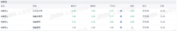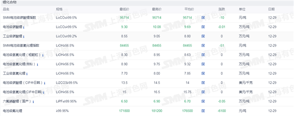 证券之星新能源车行业周报:据上海有色网,截止12月29日,电池级碳酸锂9.3-10.08万元/吨,均价9.69万元/吨,环比上一工作日下滑0.01万元/吨;工业级碳酸锂8.55-9.05万元/吨,均价8.80万元/吨,环比上一工作日持平。临近年末,市场成交依旧维持清淡局面。当前贸易商因近期期现货价差扩大,进行持续期现货套利,对锂盐端采买需求小幅增加,而部分盐厂在期货价格相对较高的情况下,交仓意愿亦有所增强,供应端挺价情绪渐浓,市场维持弱稳局面。