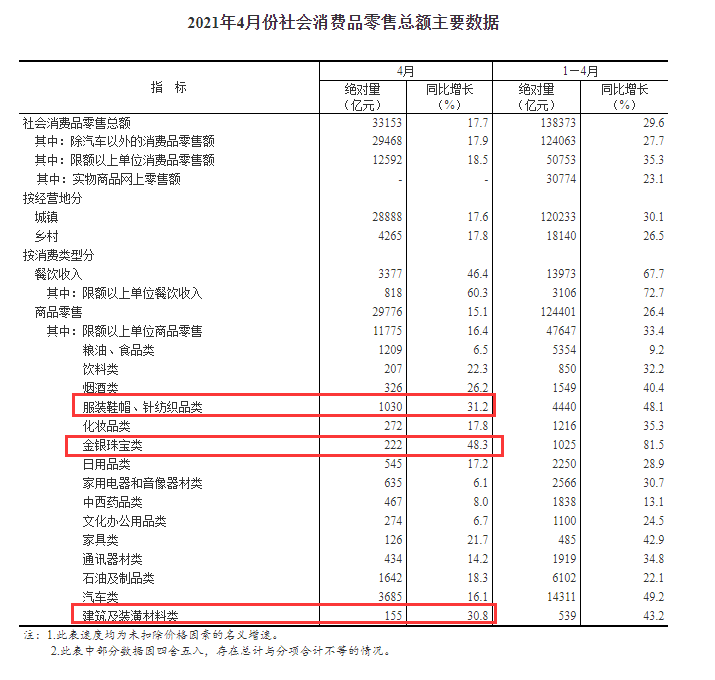 金银珠宝类增速最高,达到48.3%,但仍不及前值的83.2%;服装鞋帽、针纺织品类次之,增速为31.2%;建筑及装潢材料类排名第三,同比增长30.8%,略不及上月的43.9%。