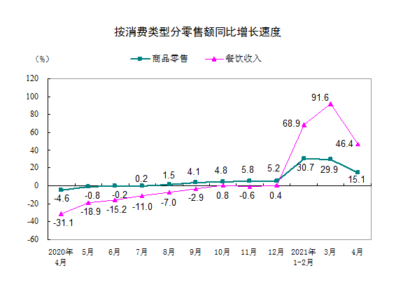 按消费类型分,4月份,商品零售29776亿元,同比增长15.1%,两年平均增长4.8%;餐饮收入3377亿元,增长46.4%,两年平均增长0.4%。