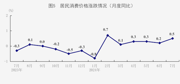 7月份,全国居民消费价格(CPI)同比上涨0.5%,涨幅比上月扩大0.3个百分点;环比上涨0.5%。分类别看,食品烟酒价格同比上涨0.2%,衣着价格上涨1.5%,居住价格上涨0.1%,生活用品及服务价格上涨0.7%,交通通信价格下降0.6%,教育文化娱乐价格上涨1.7%,医疗保健价格上涨1.4%,其他用品及服务价格上涨4.0%。在食品烟酒价格中,鲜果价格下降4.2%,粮食价格上涨0.1%,鲜菜价格上涨3.3%,猪肉价格上涨20.4%。扣除食品和能源价格后的核心CPI同比上涨0.4%。1-7月份,全国居民消费价格同比上涨0.2%。
