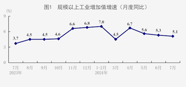 7月份,全国规模以上工业增加值同比增长5.1%,比上月回落0.2个百分点;环比增长0.35%。分三大门类看,采矿业增加值同比增长4.6%,制造业增长5.3%,电力、热力、燃气及水生产和供应业增长4.0%。装备制造业增加值增长7.3%,高技术制造业增加值增长10.0%,分别比上月加快0.4和1.2个百分点。分经济类型看,国有控股企业增加值同比增长3.5%;股份制企业增长5.4%,外商及港澳台投资企业增长4.2%;私营企业增长5.2%。分产品看,新能源汽车、集成电路、3D打印设备产品产量同比分别增长27.8%、26.9%、25.3%。1-7月份,全国规模以上工业增加值同比增长5.9%。7月份,制造业采购经理指数为49.4%,企业生产经营活动预期指数为53.1%。1-6月份,全国规模以上工业企业实现利润总额35110亿元,同比增长3.5%。