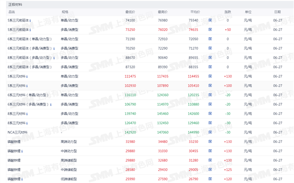 证券之星新能源车行业周报:据上海有色网,截止6月27日,电池级碳酸锂6.04-6.19万元/吨,均价6.115万元/吨,环比上一工作日上涨550元/吨;工业级碳酸锂5.905-6.005万元/吨,均价5.955万元/吨,环比上一工作日上涨550元/吨,碳酸锂现货成交价格重心呈现震荡上行。当前碳酸锂市场仍延续供大于求的基本格局,供需矛盾依然突出。从供应端看,市场可流通货源充足,库存压力尚未得到有效缓解。近期碳酸锂价格的阶段性回升主要受宏观及市场情绪等外部因素驱动,而非基本面改善所致。需求侧方面,下游正极材料企业仍保持审慎的采购策略,以刚性需求采购为主,尚未出现明显的补库意愿,市场整体观望情绪浓厚。在此市场环境下,下游材料企业更倾向于通过长协加量的方式锁定采购成本,以确保原料供应的稳定性。