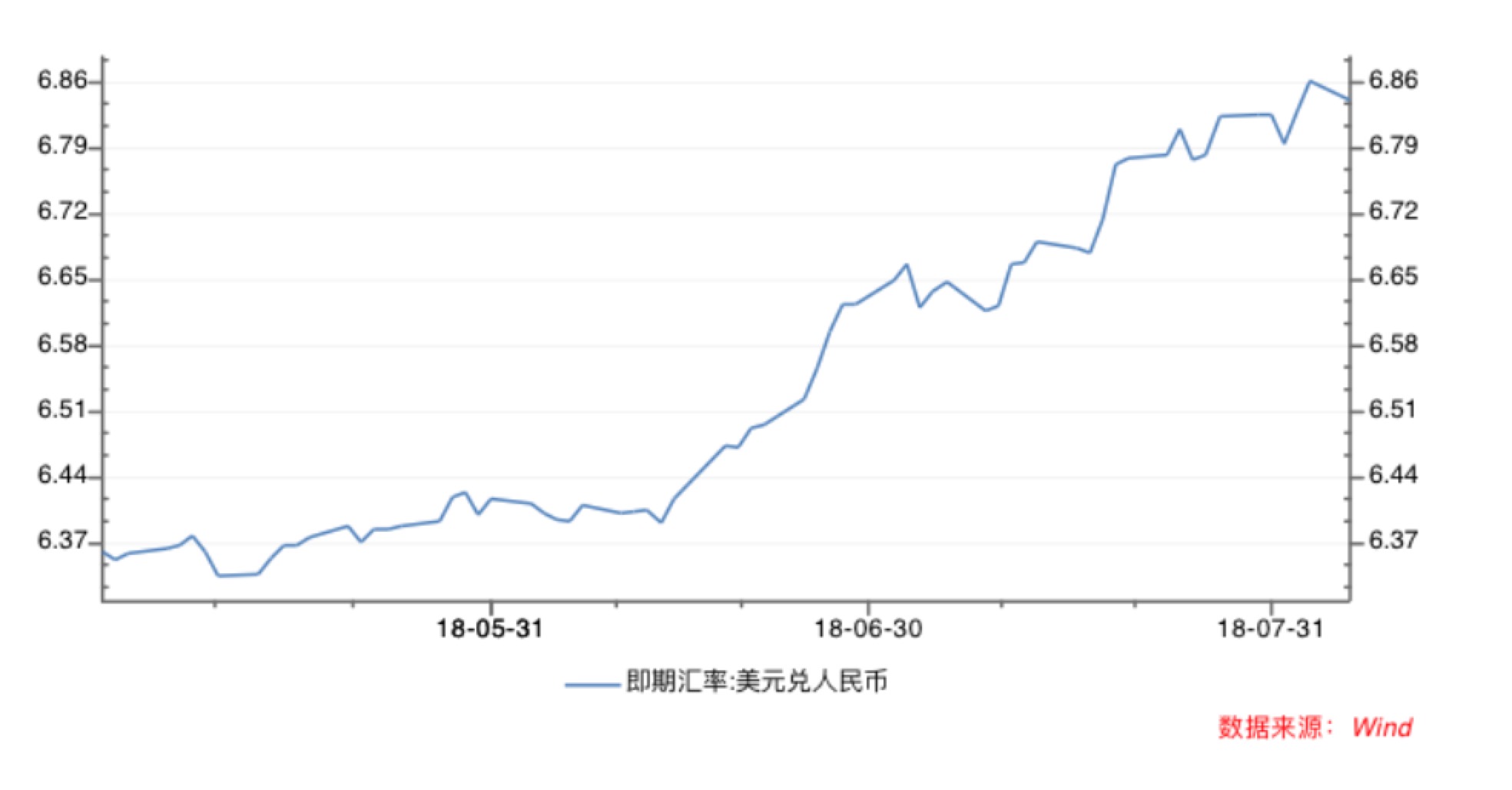 今年以来人民币汇率双向波动幅度明显增加,央行基本退出了常态式干预,年初时在岸人民币汇率一度升至6.28左右。但受到金融去杠杆、中美货币政策背离以及贸易战的影响,人民币汇率自6月以来加速贬值。