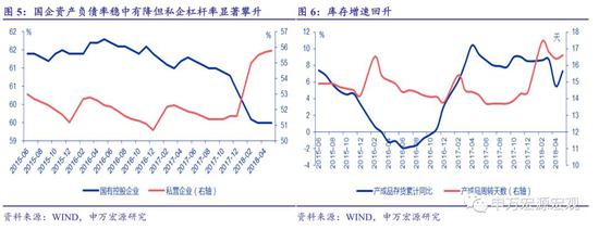 库存增速回升,企业被动补库。 5 月产成品库存增速回升至 7.3%,较 4 月提高 1.8 个百分点。由于 5 月工业生产不错但需求短的投资和消费均明显回落,企业被动补库特征明显。同时,由于需求回落,企业产品周转略放缓,产成品周转天数略提高至 16.6 天。 后续企业盈利有回落压力,去杠杆仍需要稳定的政策环境。 企业盈利及利润率与 PPI 关系密切,预计 PPI 自 7 月开始将见顶回落;且需求回落也将约束后续的工业生产,企业盈利仍有回落压力。鉴于融资约束导致企业财务费用增加以及民企杠杆率不降反升,后续政策仍需做出微调;通过加大信贷投放、降准、补充银行资本金等形式,对冲社融的回落压力。