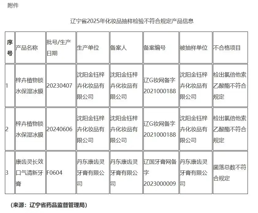 附件:辽宁省2025年化妆品抽样检验不符合规定产品信息